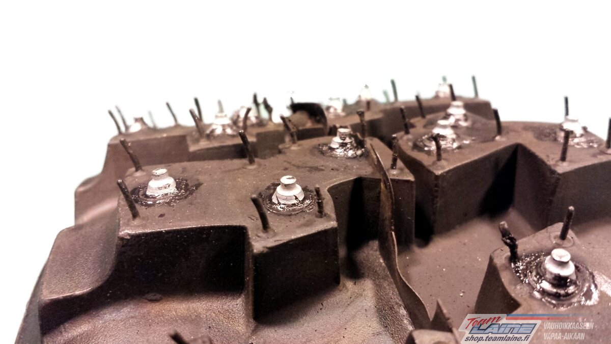 Tämä malli on nastoitettu Suomessa käyttäen Loctite nastaliimaa ja nastat on hapotettu, jotta ne pysyisivät hyvin renkaassa kovassakin rasituksessa.