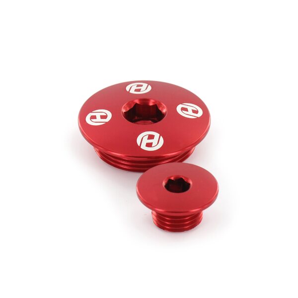 Engine Plugs Red Anodized with Holeshot logo.